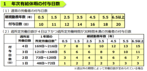 パートタイマーの年休の付与日数は、週所定労働時間、週所定労働日数および継続勤務年数に応じて、決まります(比例付与)。この比例付与による年休の付与日数は、付与する基準日時点の労働契約の内容に基づき決定されます。そのため、例えば、入社時は週所定労働日数が2日であった契約を、6ヶ月後の契約更新の際に4日にするような場合には、過去6ヶ月の週所定労働日数に関わらず、週所定労働日数4日として付与日数が決まります。